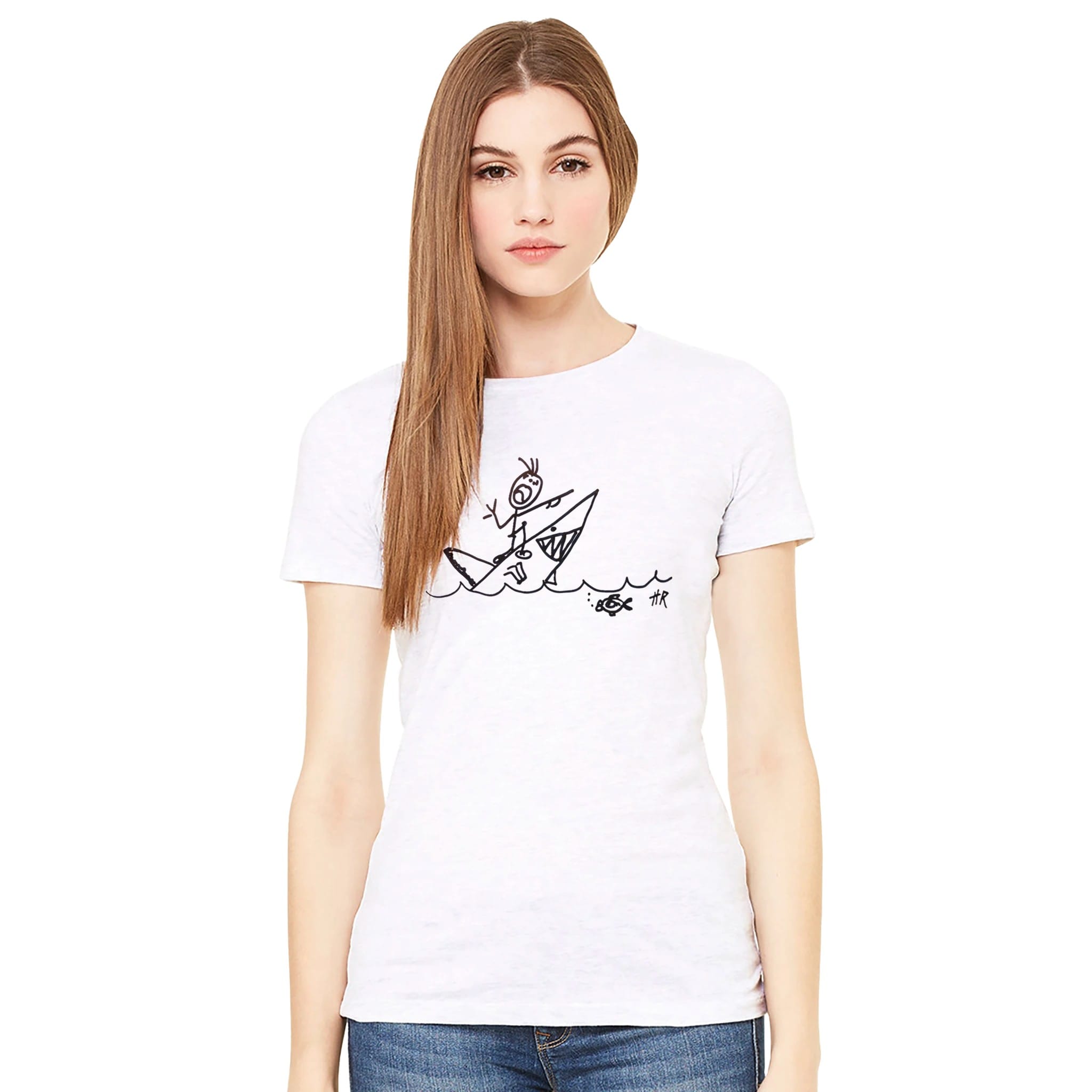 Our Heidoodles Shark Ride! women’s t-shirt is constructed from 100% Airlume combed and ring-spun cotton, with heather/blend colors incorporating polyester.